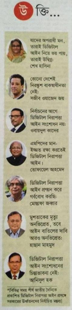 সংসদ সদস্যদের মান-ইজ্জত রক্ষা করতেই ডিজিটাল নিরাপত্তা আইন-২০১৮ করা হয়েছে বলে জানিয়েছেন বাণিজ্যমন্ত্রী তোফায়েল আহমেদ। তিনি বলেন, ‘আপনারা (সাংবাদিকরা) গণমাধ্যমে যেভাবে বিভিন্ন সংসদ সদস্যের বিরুদ্ধে রিপোর্ট করেন, তাতে তাদের মান-ইজ্জত থাকে না। তাদের সম্মান ক্ষুণ্ন হয়। তারা তো জনপ্রতিনিধি। তাই এগুলো ঠেকাতেই এ আইন করা হয়েছে।’