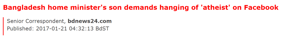 স্বরাষ্ট্রমন্ত্রীর ছেলে নাস্তিক ব্লগারের ফাঁসি দাবী করে ফেসবুক পোস্ট