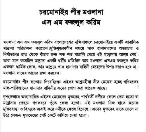 চরমোনাইর পীর ফতোয়া দিয়েছিলেন এইসব আশ্রয়হীনা ভীত মেয়েরা হচ্ছে গণিমতের মাল-পাকিস্তানের হানাদার বাহিনীর এদের ভোগ করা জায়েজ আছে।