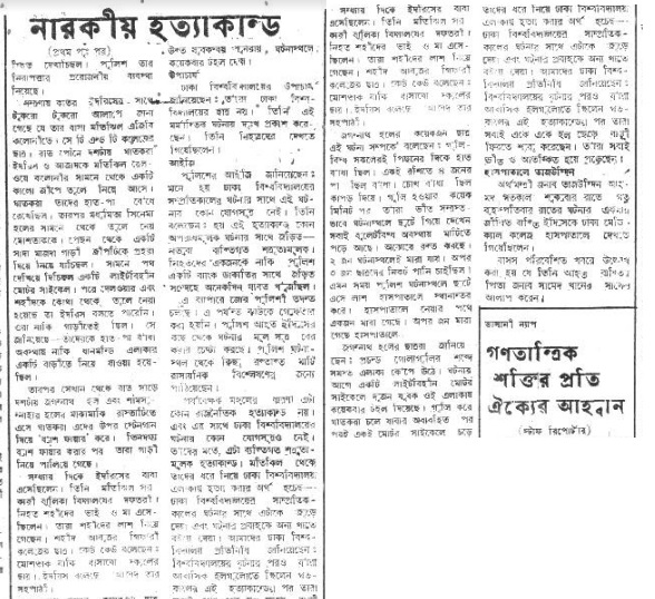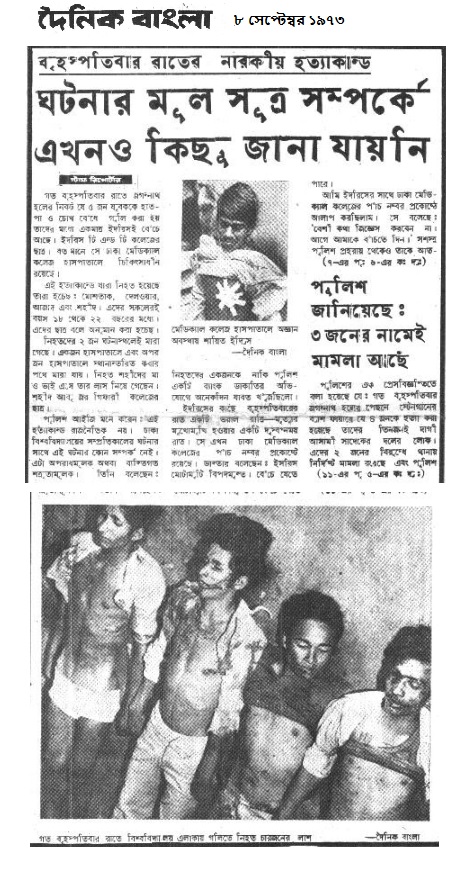 এই হত্যাকাণ্ডের বিষয়ে একটা লেখা প্রায় সময় ফেসবুকে দেখা যায়-“এই তরুণরা খুন হন শামসুন্নাহার হলের পার্শ্ববর্তী শিক্ষকদের আবাসিক এলাকায়। এ ঘটনায় চারজন মারা গেলেও ইদ্রিস নামে একজন আহত অবস্থায় বেঁচে যান। ঢাকা বিশ্ববিদ্যালয়ের শিক্ষক ড. বি ওয়ালিউর রহমানের স্ত্রী বিলকিস রহমান, যিনি তখন দ্য মর্নিং নিউজ পত্রিকায় কাজ করতেন, তিনি ছিলেন উল্লিখিত ঘটনার একজন প্রত্যক্ষদর্শী! ১৯৭৩ সালের সেপ্টেম্বরে এ বিষয়ে পত্রিকায় মতামত প্রকাশের কারণে সরকারি চাপে তিনি মর্নিং নিউজ থেকে চাকরীচ্যুত হয়েছিলেন। তবে ১৯৭৩ সালের ৮ সেপ্টেম্বর সেই রাতের হত্যাকাণ্ডের ঘটনায় বেঁচে যাওয়া আহত ইদ্রিসের জবানীতে দ্য মর্নিং নিউজে এই হত্যাকাণ্ডের নায়কদের সম্পর্কে ইঙ্গিত-পূর্ণ অনেক তথ্য প্রকাশিত হয়ে পড়লে তা সেই সময় রাজনৈতিকভাবে প্রভাবশালী অনেকের জন্য বিব্রতকর হয়ে ওঠে।“