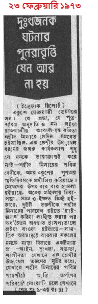 বিশে ফেব্রুয়ারি সন্ধ্যার পর হইতেই শহীদ মিনারে ভিড় জমিতে শুরু করে-কিন্তু অন্যান্য বারের মতন এবার শহীদ মিনারের শৃঙ্খলা রক্ষার দায়িত্ব কোন প্রতিষ্ঠানের পক্ষ হইতে লওয়া হয় নাই। ফলে রাত্রি ১১ টার পর হইতে সেখানে অসংখ্য নারী-পুরুষের মধ্যে শ্রেণীর সুযোগ সন্ধানীও সমবেত হইতে থাকে। গতবারের মতন এবার শহীদ মিনারে আলোর ব্যবস্থা করা হয় নাই। অন্ধকারের সুযোগ লইয়া এই সুযোগ সন্ধানীর দল যথেচ্ছ কাণ্ড করিয়াছে। ঢাকা নগর আওয়ামী লীগ মহিলা শাখার মিছিলটি যখন মধ্যরাত্রিতে শহীদ মিনারে পুষ্প মালা অর্পণ করিতেছিলেন তখন মিনারের বাঁ পাশের কোণায় উচ্ছৃঙ্খল যুবকদের হাতে দুই জন তরুণী লাঞ্ছিতা হন। সবচাইতে জঘন্য ঘটনা ঘটে ভোর চারটা হইতে সাড়ে চারটার মধ্যে। এই সময় বিভিন্ন স্থান হইতে অনেক প্রভাত ফেরী শহীদ মিনারে আসিয়া উপস্থিত হয়। পুষ্পমালা অর্পণের ক্ষেত্রে অন্যান্য-বারের মতন এবার মহিলা ও পুরুষদের জন্যে কোন পৃথক ব্যবস্থা না থাকায় দেখা যায় যে, উচ্ছৃঙ্খল সুযোগ-সন্ধানীরা এক বিশেষ কায়দায় কয়েকটি মেয়েকে দল হইতে বিচ্ছিন্ন করিয়া ঘিরিয়া শহীদ মিনারের পাদদেশে আনিয়া ফেলিয়াছে। তাহাদের আচরণ এমন এক পর্যায়ে চলিয়া যায় যে, অনেক কিশোরী ও তরুণীর পরিধানের বস্ত্র পর্যন্ত ছিন্নভিন্ন হইয়া যায়। শহীদ মিনার যে সামান্য প্রদীপ-সদৃশ আলোর ব্যবস্থা ছিল ডেসপাযোগে কয়েকজন তরুণের উপস্থিতির মাত্র কয়েক মিনিট পরেই অজ্ঞাতকারণে সেগুলো নিভিয়া যায় এবং তখনই এই লঙ্কাকাণ্ডের সূচনা হয়। শহীদ মিনারের পাদদেশে হইতে আগতা জনৈকা কিশোরীকে অর্ধ-চৈতন্য অবস্থায় বাড়ীতে পাঠাইয়া দেওয়া হয়। ১৭ বৎসর বয়স্কা ও ২২ বৎসর বয়স্কা দুটি তরুণীও এই সময় নিখোঁজ হয়। তাহাদিগকে নিগৃহীত ও অর্ধ-চৈতন্য অবস্থায় হাসপাতালে লইয়া যাওয়া হয় এবং পরে তাহাদিগকে প্রাথমিক চিকিৎসা করাইয়া হইতে লইয়া যাওয়া হয় বলিয়া নির্ভরযোগ্য সূত্রে জানা গিয়াছে।