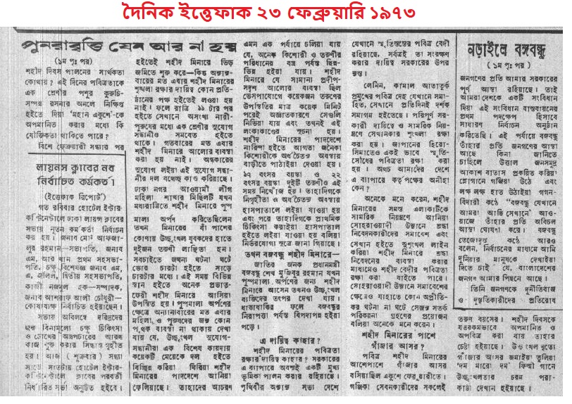 ২১শে ফেব্রুয়ারিতে শহীদ মিনারে পুরুষ-নারী সবাই ফুল দিতে এসেছিল। সেই রাতে এক শ্রেণীর উচ্ছৃঙ্খল লোকজন মেয়েদের উপর বারবার হামলা চালিয়েছিল। ইত্তেফাক বলছে; “ অনেক মহিলার নিরাপত্তা, সম্ভ্রম ও ইজ্জত বিনষ্ট হইয়াছে, দুটি তরুণীকে শহীদ মিনারের পাদদেশ হইতে হাইজ্যাক করিয়া লাঞ্ছিত করার পর অর্ধ চৈতন অবস্থায় হাসপাতালে লইয়া যাওয়া হইয়াছে-সামগ্রিক অবস্থাদৃষ্টে বারবার সকলের মনকে নাড়া দিয়াছে।