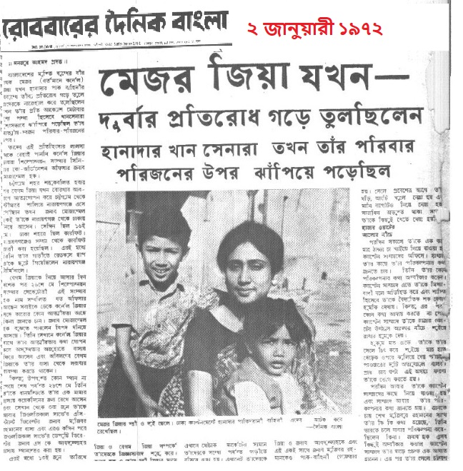 মেজর জিয়া শেখ মুজিবের পক্ষে স্বাধীনতার ঘোষণা দেন। আর এই কারণে তার পরিবার ও আত্মীয় স্বজনকেও ঝামেলায় পড়তে হয়। খালেদা জিয়াকে গ্রেফতারের জন্যে পাকিস্তানী বাহিনী সব জায়গায় তল্লাসী শুরু করে। সেই ঘটনার একটা অংশ দৈনিক বাংলায় প্রকাশিত হয়। এখানে পত্রিকার লেখাটি তুলে ধরা হল।