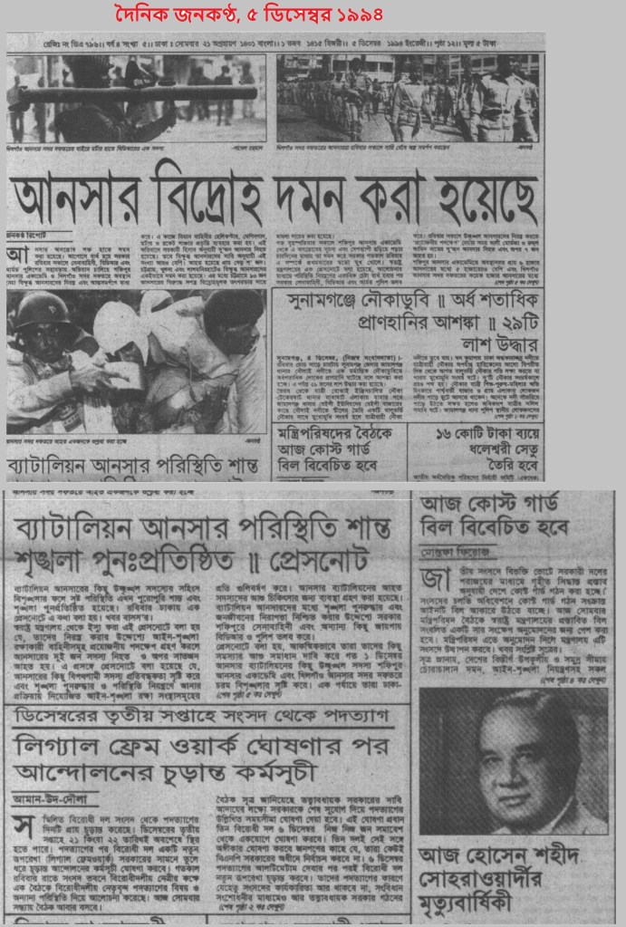 “সেনাবাহিনীর কর্মকর্তাদের প্রত্যাহার, রেশন-বেতন বৃদ্ধিসহ বেশ কিছু দাবিতে ১৯৯৪ সালে আনসার বাহিনীর সদস্যদের মধ্যে অসন্তোষ দেখা দেয়। যা ওই বছরের ৩০শে নভেম্বর বিদ্রোহে রুপ নেয়। ওই দিন আনসার সদস্যরা ৪০ জন সেনা কর্মকর্তা ও তাদের পরিবারকে জিম্মি করে এবং তৎকালীন প্রধানমন্ত্রী খালেদা জিয়ার সাথে সাক্ষাত করতে চান। প্রধানমন্ত্রীর নির্দেশে ওই বছরের ৪ঠা ডিসেম্বর সেনাবাহিনী, বিডিআর (বর্তমান বিজিবি) ও পুলিশ বিদ্রোহ নিয়ন্ত্রণ করে। যৌথ অভিযানে ৪ জন বিদ্রোহী মারা যায় ও ১৫০ জন আহত হয়। ব্যর্থ হয় আনসারদের বিদ্রোহ। ঘটনার পরে শাস্তি হিসেবে দুই হাজার ৪৯৬ জন আনসার সদস্যকে গ্রেপ্তার ও চাকরিচ্যুত করা হয়।”- উইকিপিডিয়া