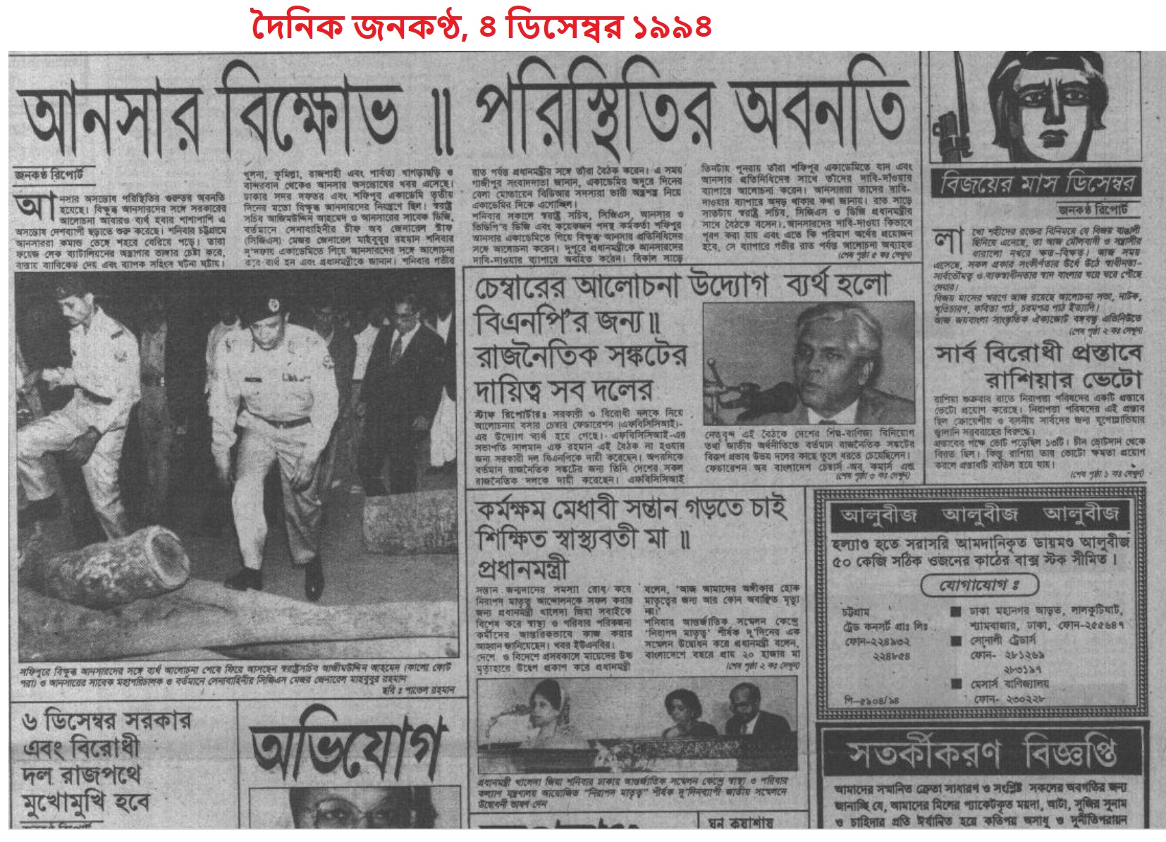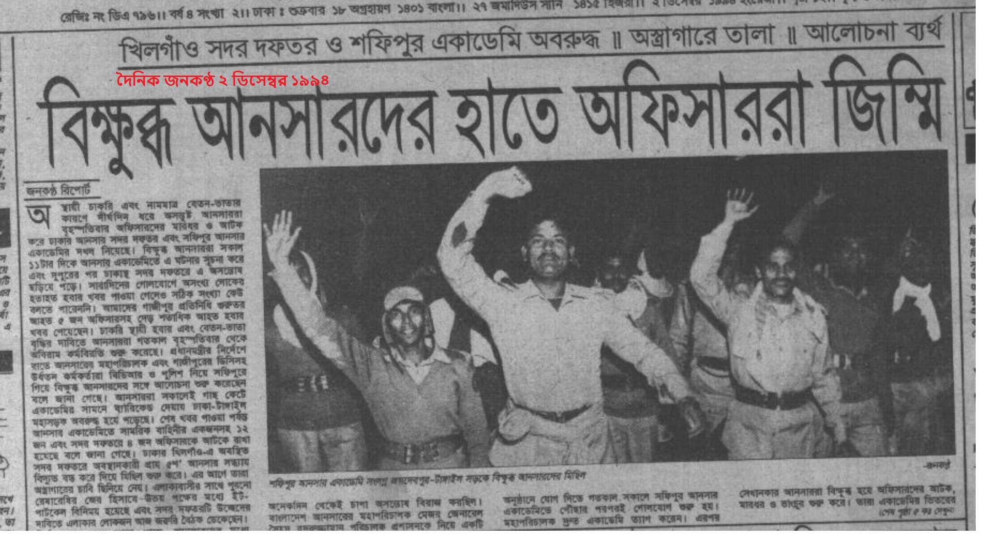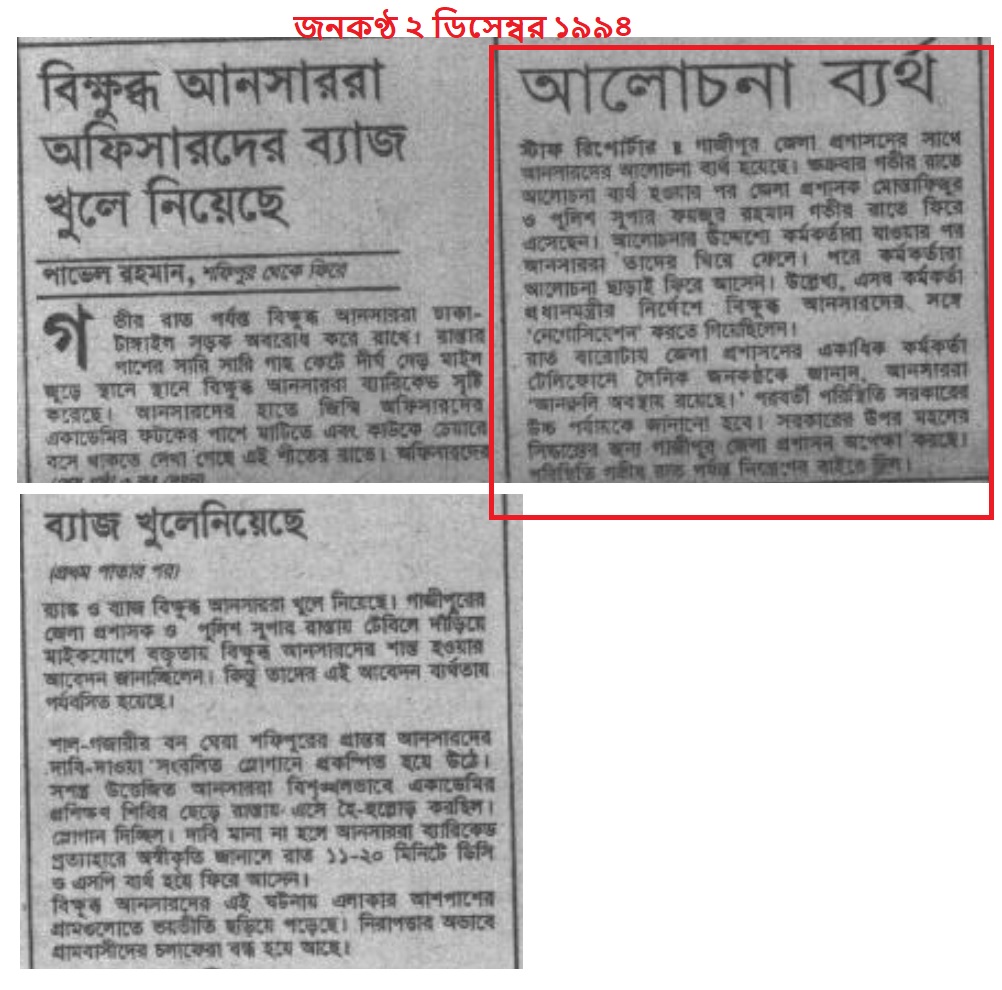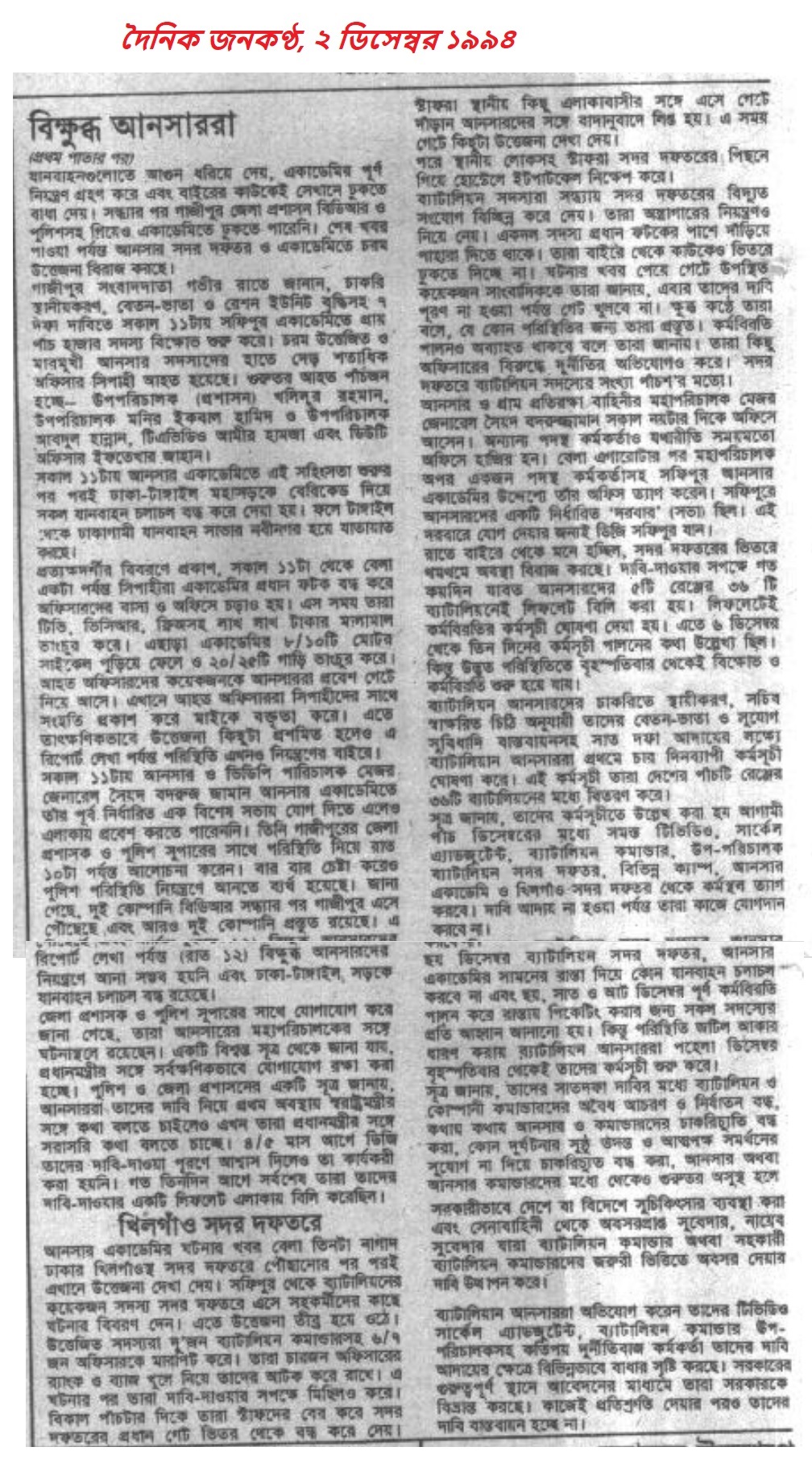“সেনাবাহিনীর কর্মকর্তাদের প্রত্যাহার, রেশন-বেতন বৃদ্ধিসহ বেশ কিছু দাবিতে ১৯৯৪ সালে আনসার বাহিনীর সদস্যদের মধ্যে অসন্তোষ দেখা দেয়। যা ওই বছরের ৩০শে নভেম্বর বিদ্রোহে রুপ নেয়। ওই দিন আনসার সদস্যরা ৪০ জন সেনা কর্মকর্তা ও তাদের পরিবারকে জিম্মি করে এবং তৎকালীন প্রধানমন্ত্রী খালেদা জিয়ার সাথে সাক্ষাত করতে চান। প্রধানমন্ত্রীর নির্দেশে ওই বছরের ৪ঠা ডিসেম্বর সেনাবাহিনী, বিডিআর (বর্তমান বিজিবি) ও পুলিশ বিদ্রোহ নিয়ন্ত্রণ করে। যৌথ অভিযানে ৪ জন বিদ্রোহী মারা যায় ও ১৫০ জন আহত হয়। ব্যর্থ হয় আনসারদের বিদ্রোহ। ঘটনার পরে শাস্তি হিসেবে দুই হাজার ৪৯৬ জন আনসার সদস্যকে গ্রেপ্তার ও চাকরিচ্যুত করা হয়।”- উইকিপিডিয়া
