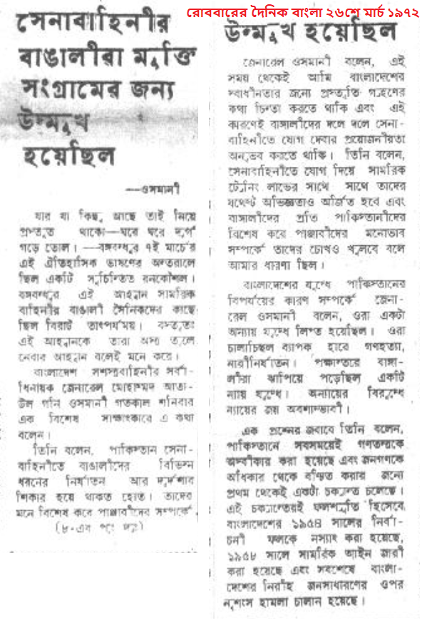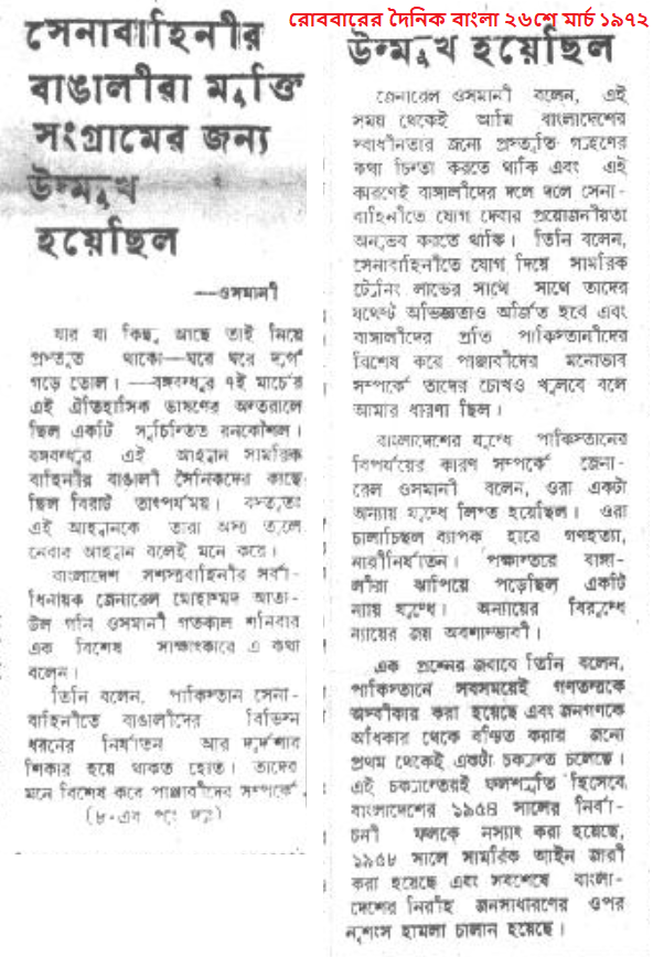 বাংলাদেশ সশস্ত্র-বাহিনীর সর্বাধিনায়ক জেনারেল মোহাম্মদ আতাউল গনি ওসমানী গতকাল শনিবার এক বিশেষ সাক্ষাৎকারে এ কথা। তিনি বলেন, পাকিস্তান সেনাবাহিনীতে বাঙালীদের বিভিন্ন ধরনের নির্যাতন আর দুর্দশার শিকার হয়ে থাকত হোত। তাদের মনে বিশেষ করে পাঞ্জাবীদের সম্পর্কে জেনারেল ওসমানী বলেন, এই সময় থেকেই আমি বাংলাদেশের স্বাধীনতার জন্যে প্রস্তুতি গ্রহণের কথা চিন্তা করতে থাকি এবং এই কারণেই বাঙ্গালীদের দলে দলে সেনাবাহিনীতে যোগ দেবার প্রয়োজনীয়তা অনুভব করতে থাকি। তিনি বলেন, সেনাবাহিনীতে যোগ দিয়ে সামরিক ট্রেনিং লাভের সাথে সাথে তাদের যথেষ্ট অভিজ্ঞতাও অর্জিত হবে এবং বাঙ্গালীদের প্রতি পাকিস্তানীদের বিশেষ করে পাঞ্জাবীদের মনোভাব সম্পর্কে তাদের চোখও খুলবে বলে আমার ধারণা ছিল।