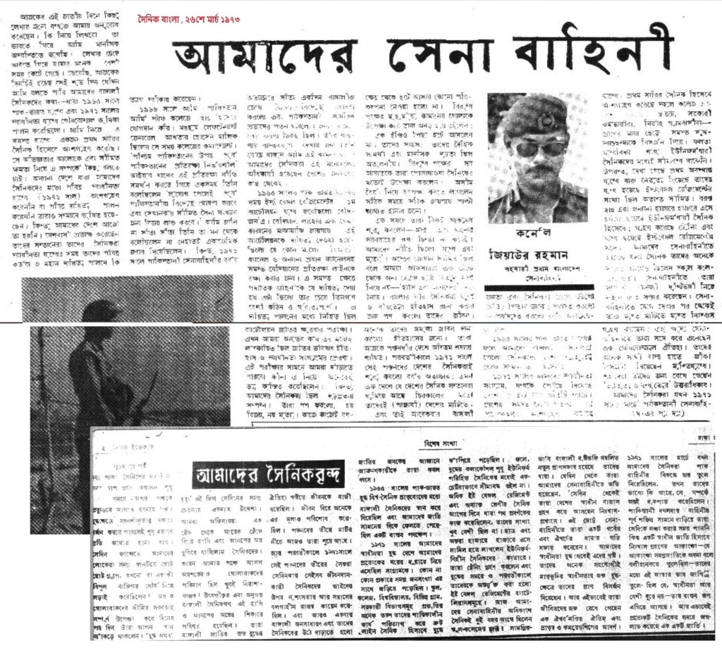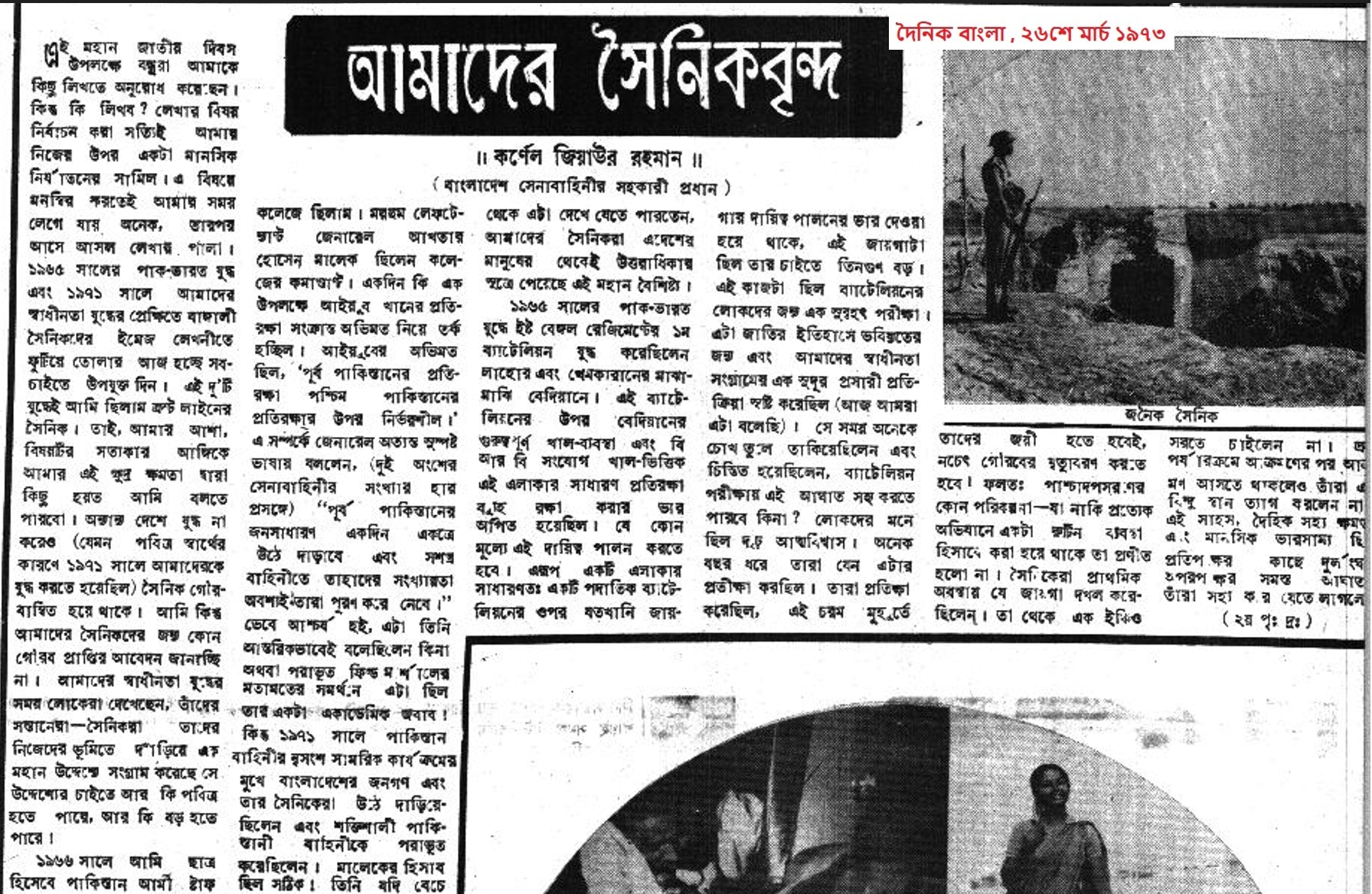 ৭৩ সালে বন্ধুদের অনুরোধে কর্নেল জিয়া প্রথমবারের মতন পত্রিকায় কলাম লেখেন। কলামে জিয়া তার মিরিটারি জীবনের ইতিহাসের সাথে সাথে ৬৫ সালের ভারত-পাকিস্তানে যুদ্ধে এবং ৭১ সালে বাঙালি সেনাদের সাহসিকতার ইতিহাস তুলে ধরেন। দৈনিক বাংলায় প্রকাশিত কলামের নাম ছিল ”আমাদের সেনা বাহিনী”। এখানে একটি কথা হয়তো বলা দরকার, উর্দু ও ইংরেজিতে শিক্ষা গ্রহণের ফলে স্বাভাবিকভাবে জিয়ার রহমান সাবলীলভাবে বাংলা লিখতে ও পড়তে পারতেন না। সুতরাং তার লেখাটি পত্রিকার পাতায় অনুবাদই বলা যায়। কিংবা অন্য কেউ বাংলায় কলাম লিখতে সাহায্য করেছেন। সেই কলামে জিয়া স্পষ্ট করে লিখছেন, জাতির জনকের আহ্বানে সৈনিকরা সেদিন যুদ্ধে ঝাঁপিয়ে পড়েন।